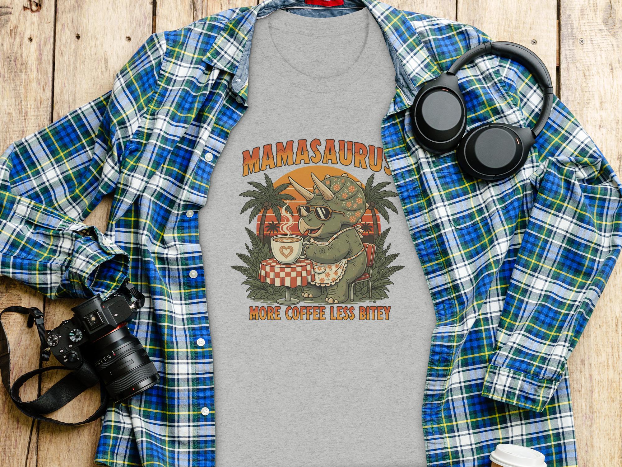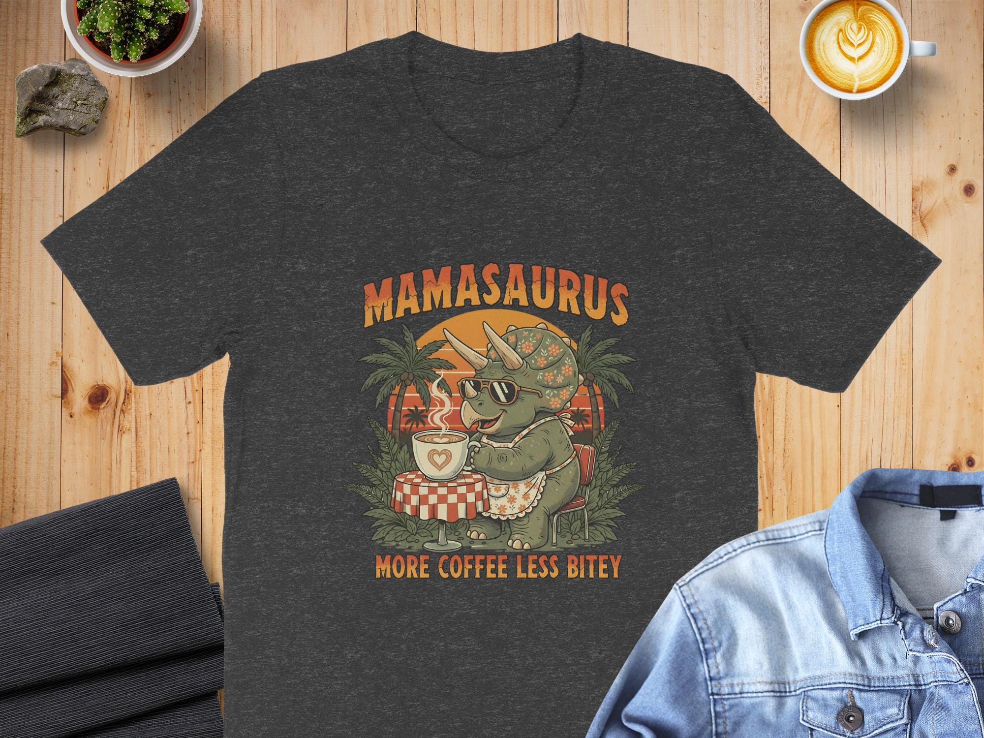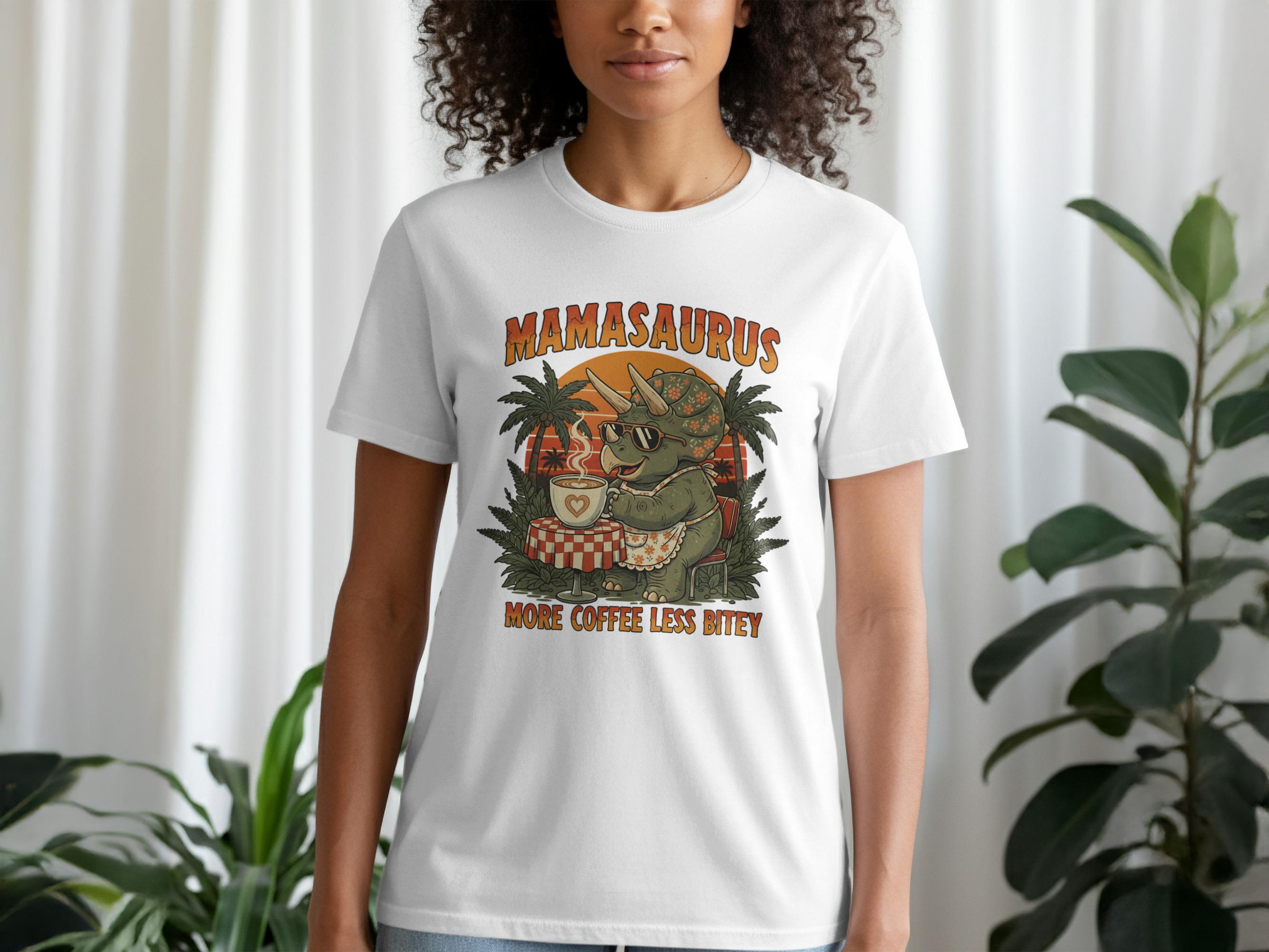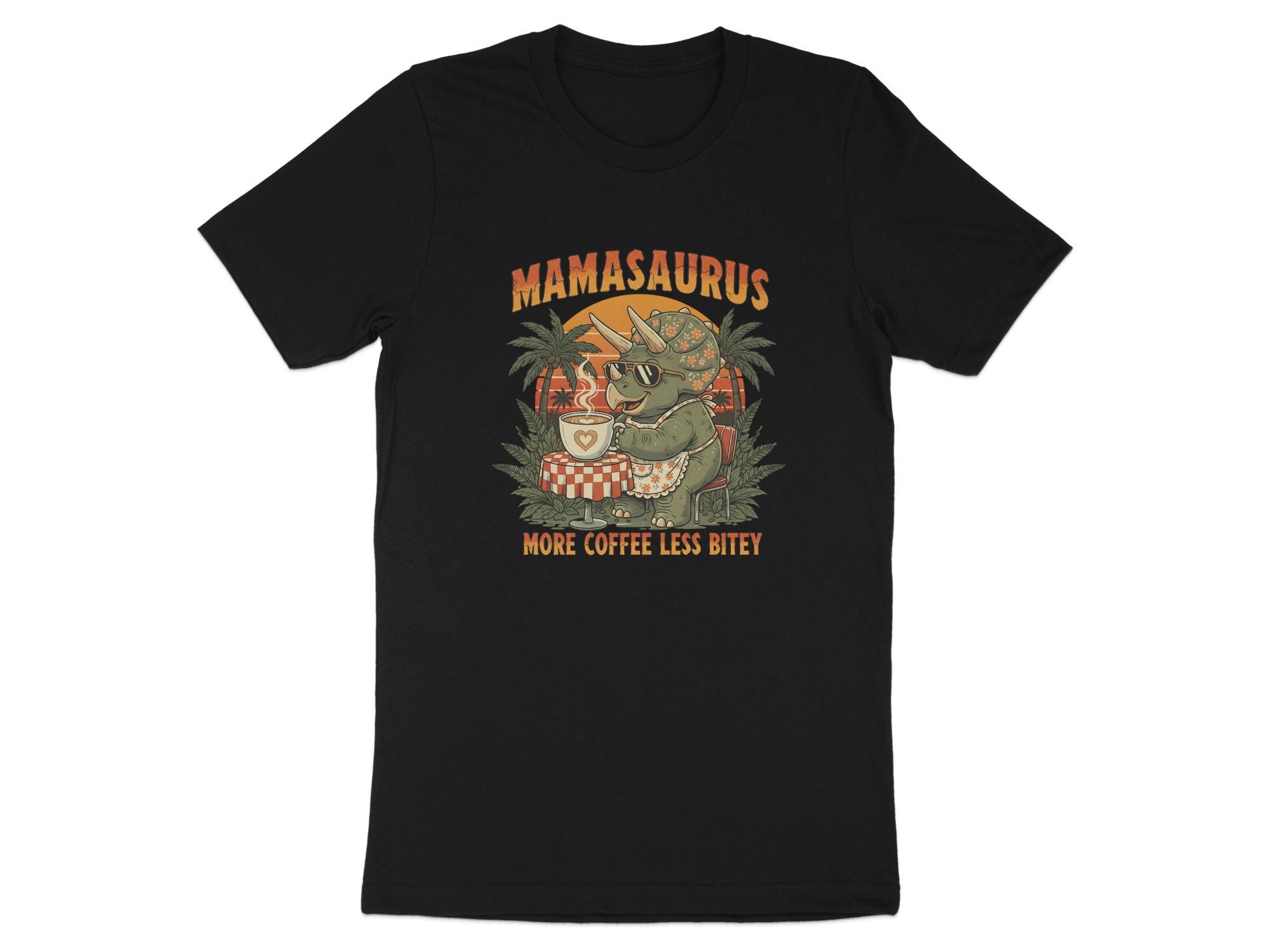 This T-Shirt features an adorable Mamasaurus, a dinosaur mom, enjoying her coffee in a tropical setting. The design includes the text "Mamasaurus" and "More Coffee Less Bitey," perfect for any mom who loves dinosaurs and coffee.