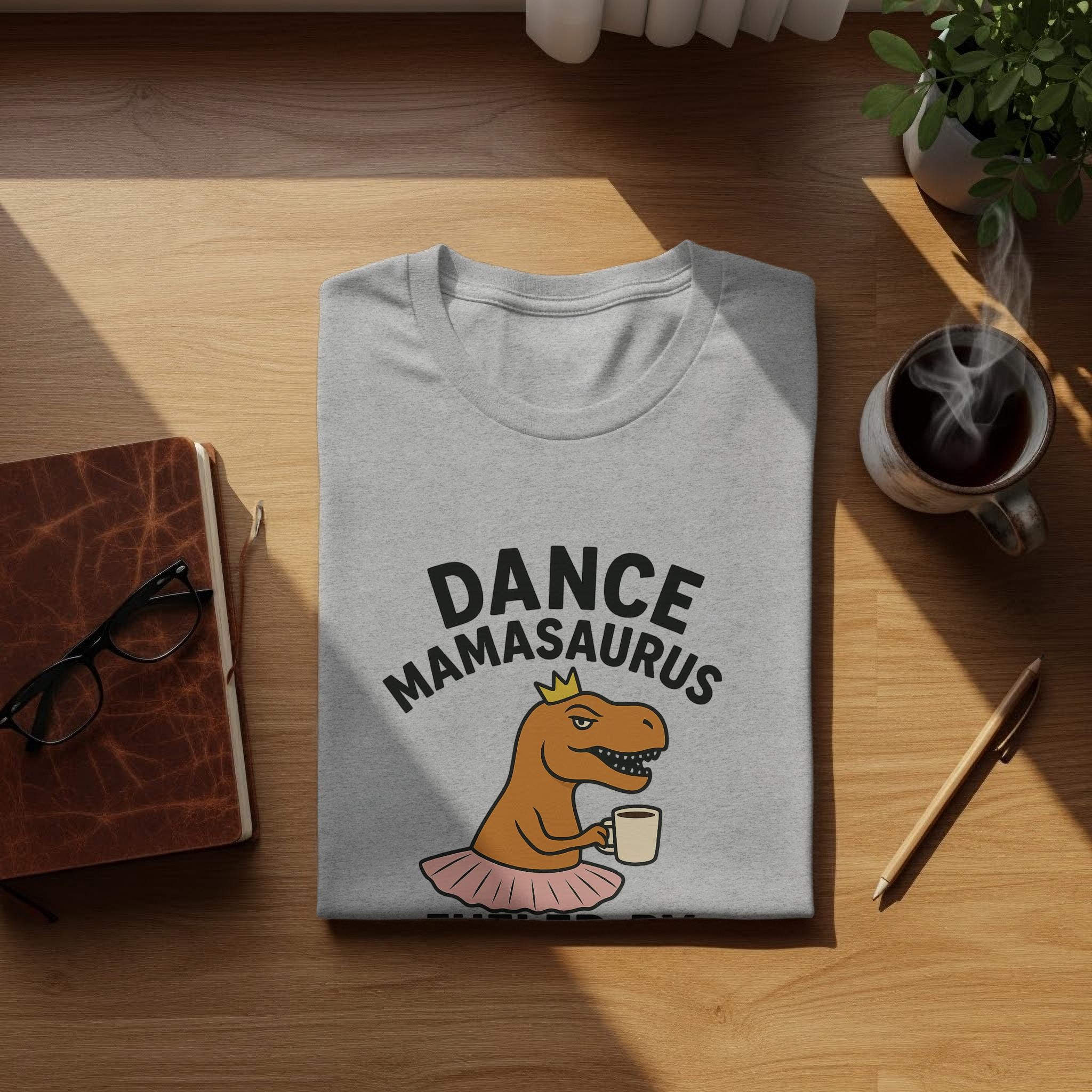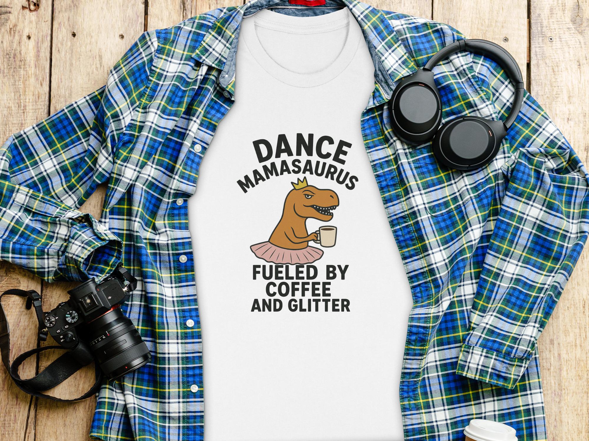 Looking for a unique and fun T-Shirt for yourself or a special mom in your life? This "Dance Mamasaurus Fueled By Coffee And Glitter" tee is perfect!