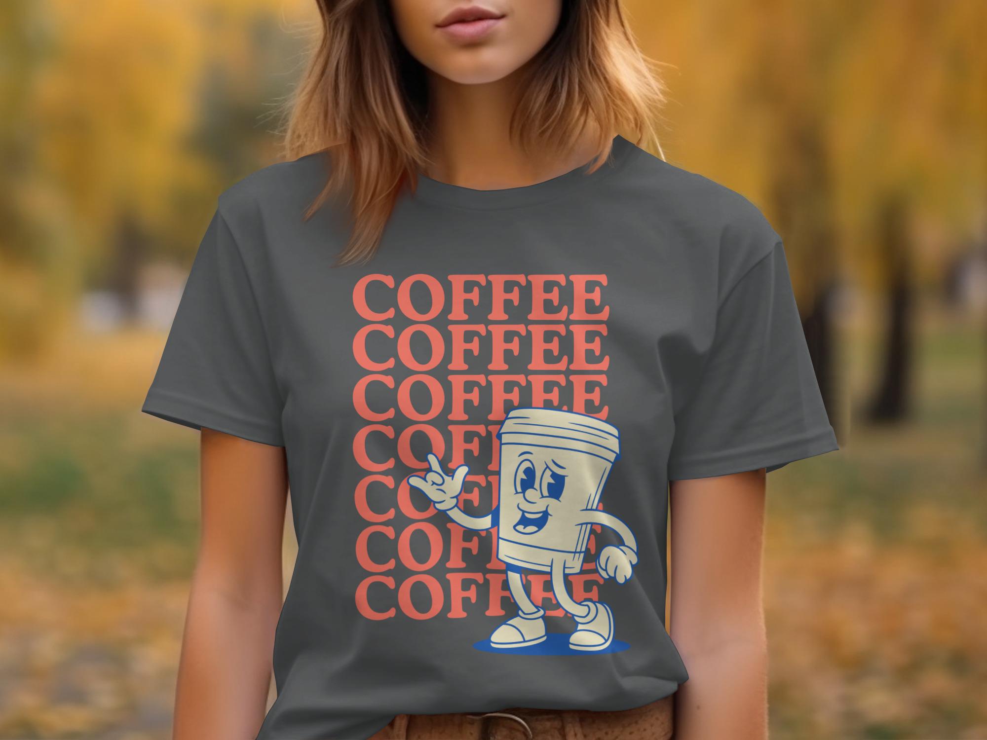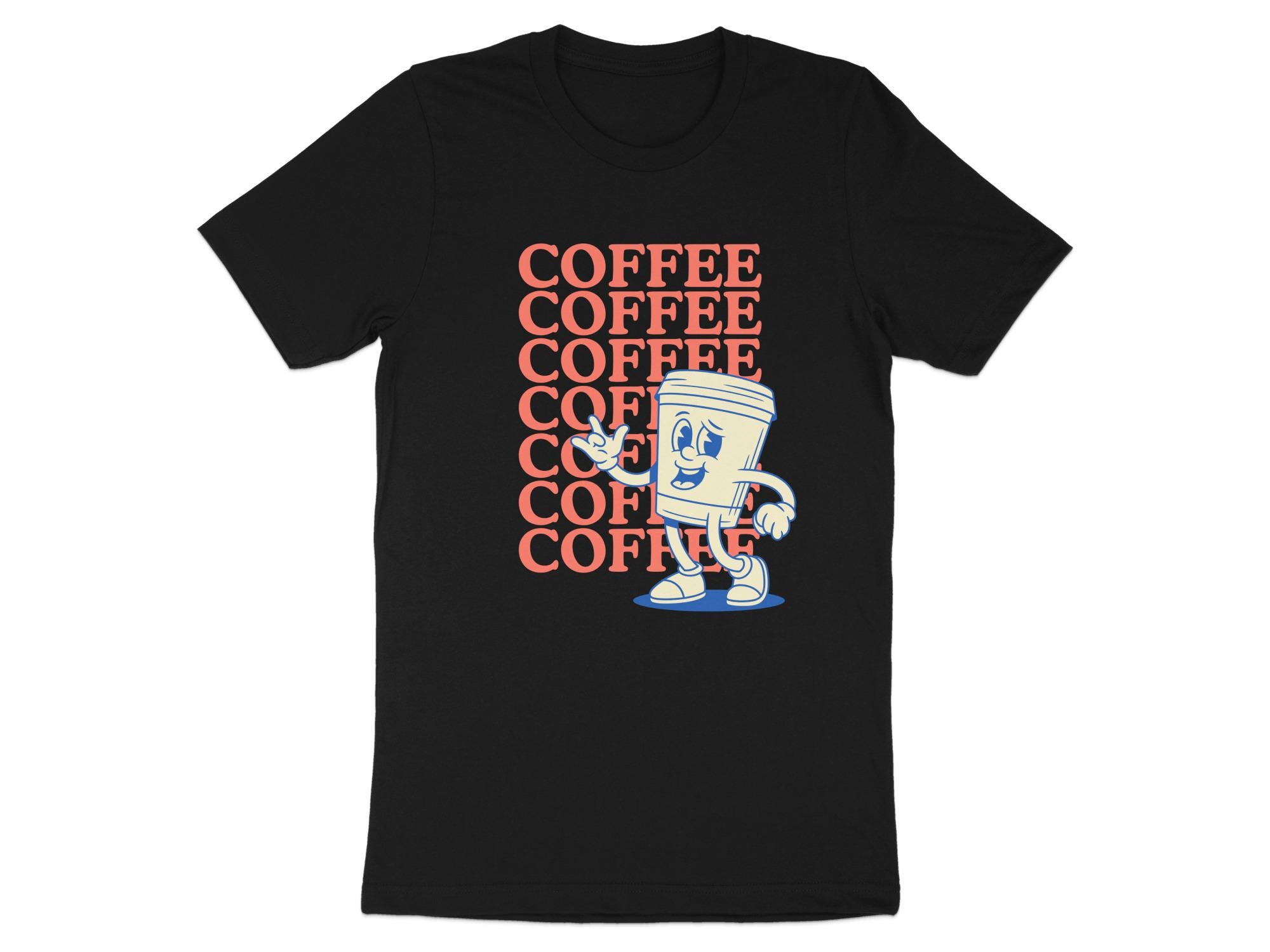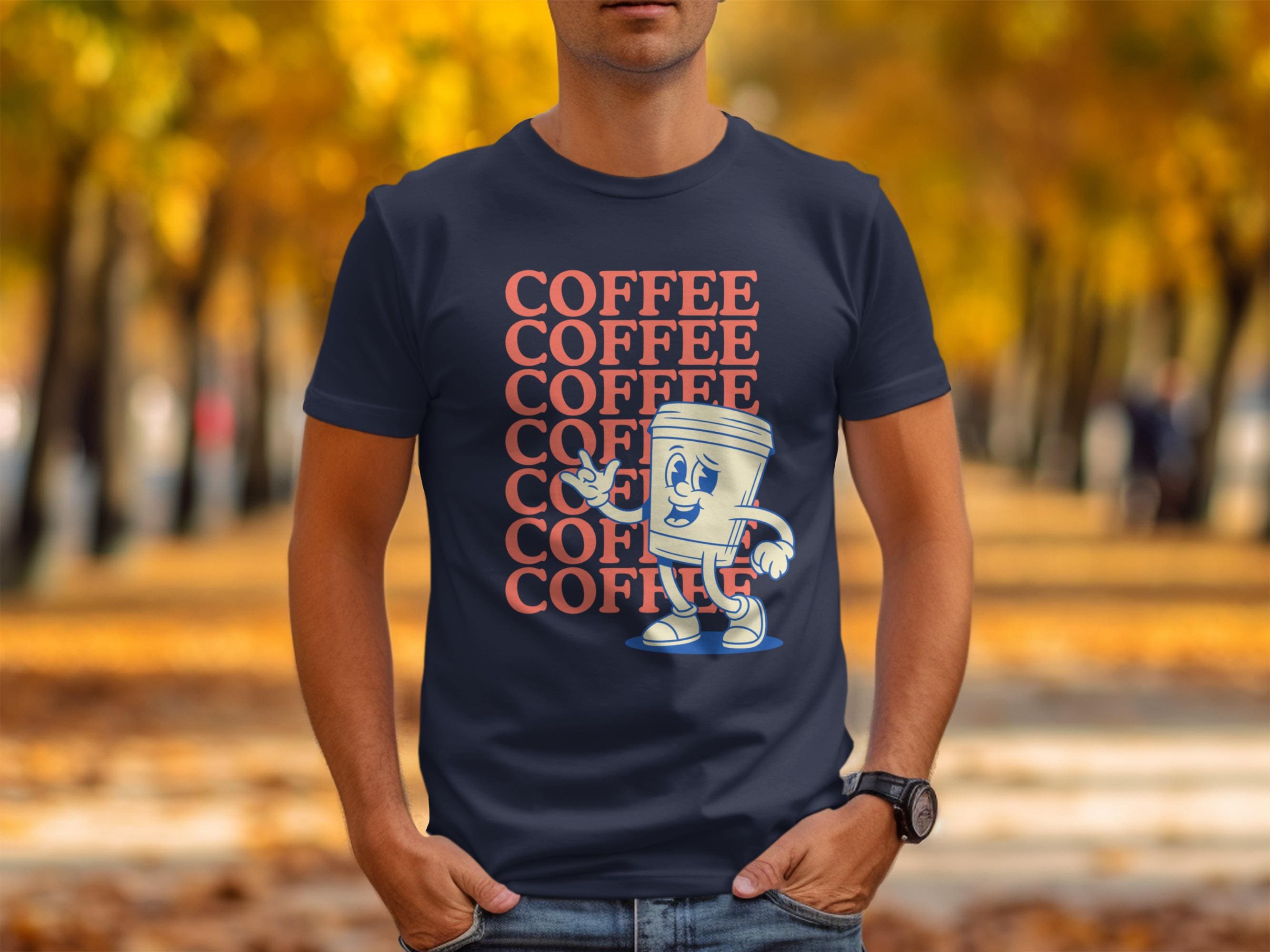 This t-shirt features a cool retro cartoon coffee cup character.