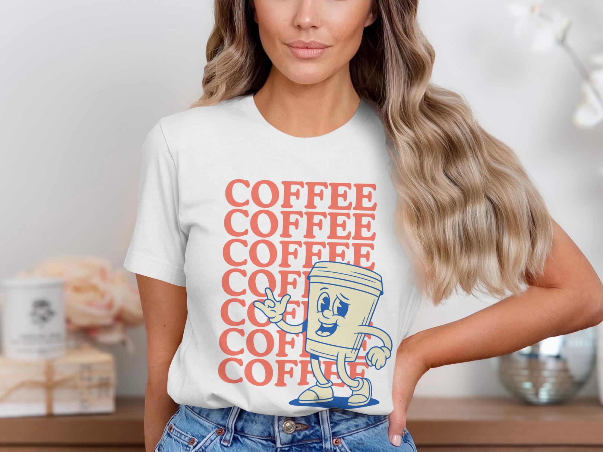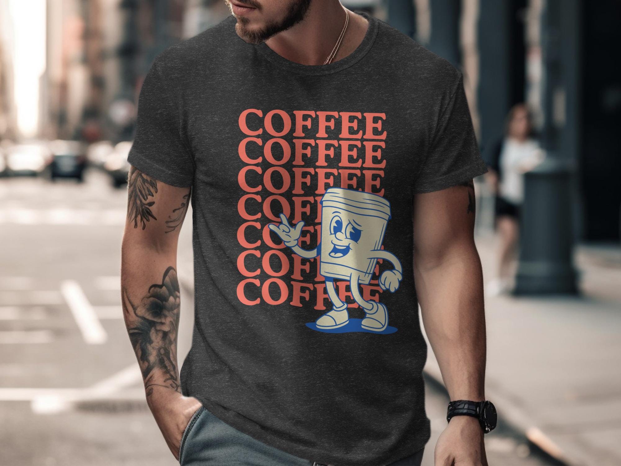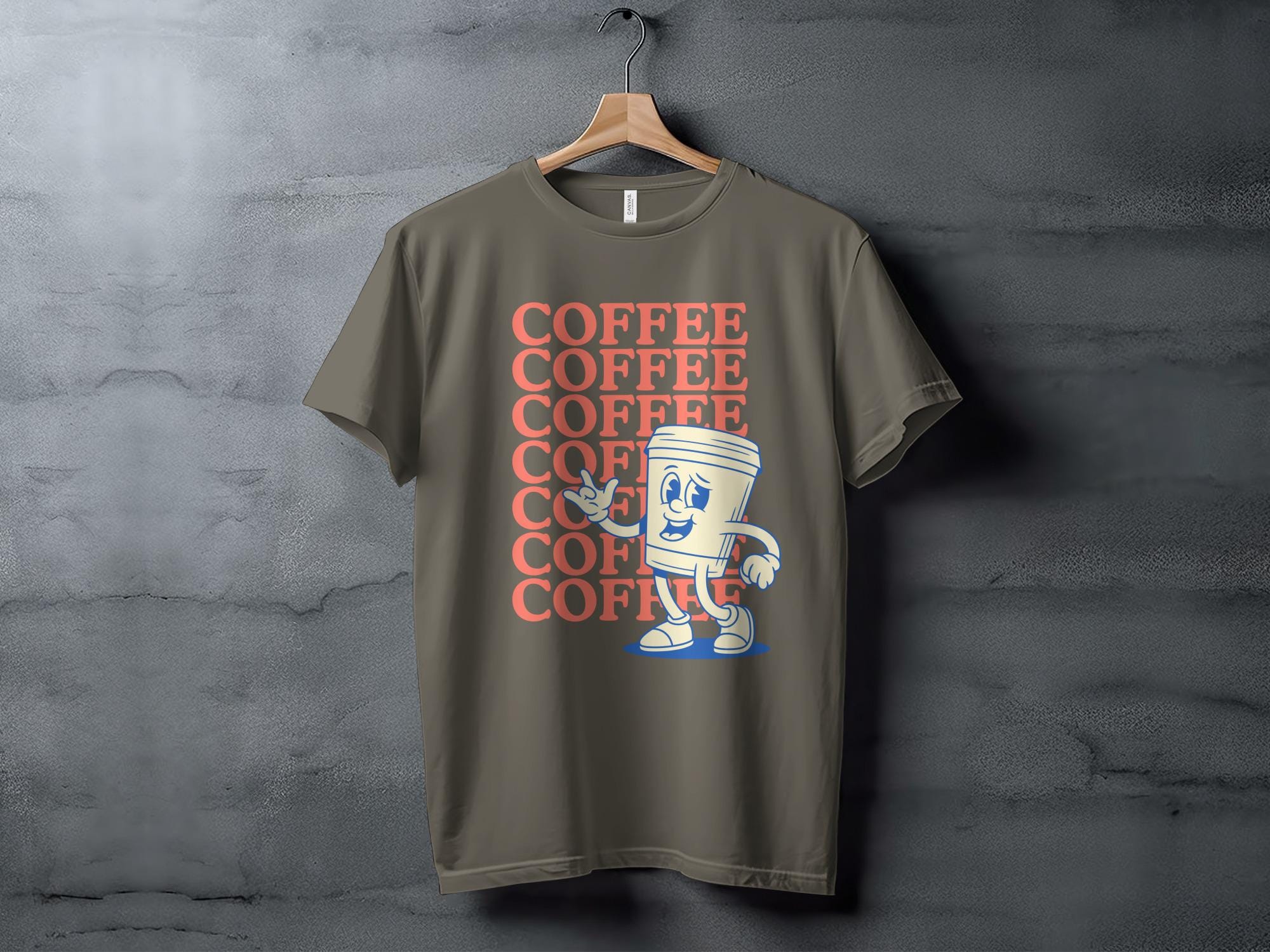 This t-shirt features a cool retro cartoon coffee cup character.
