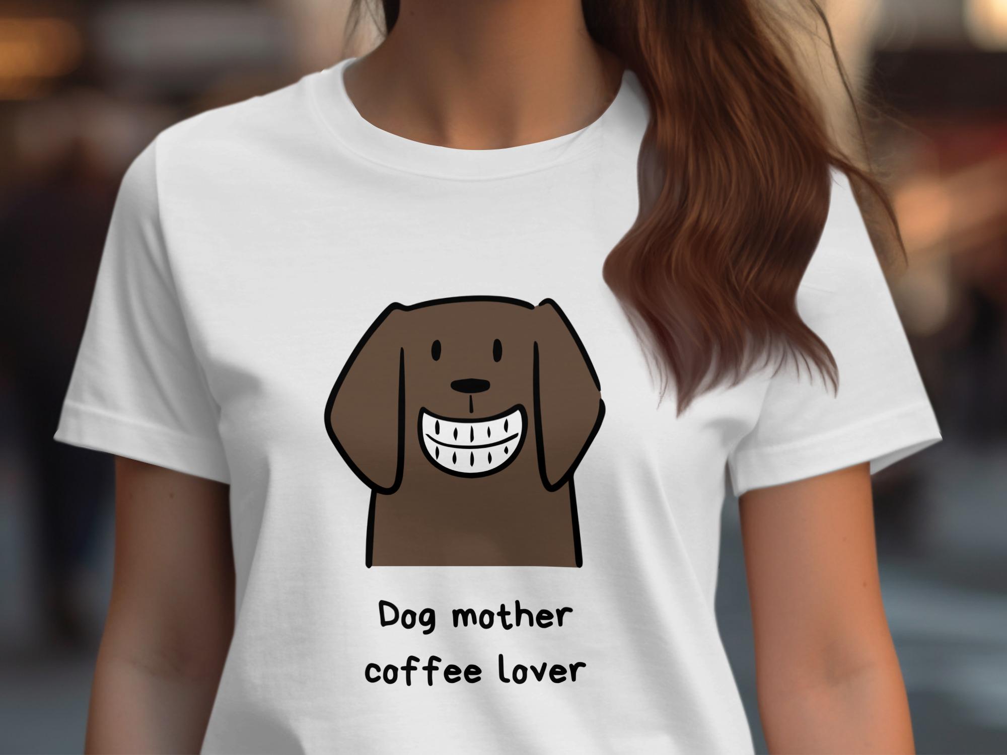 This T-shirt features a cute, cartoon style dog graphic. It is a perfect gift for dog mothers who are also coffee lovers. This tee will bring smile to everyone who sees it.