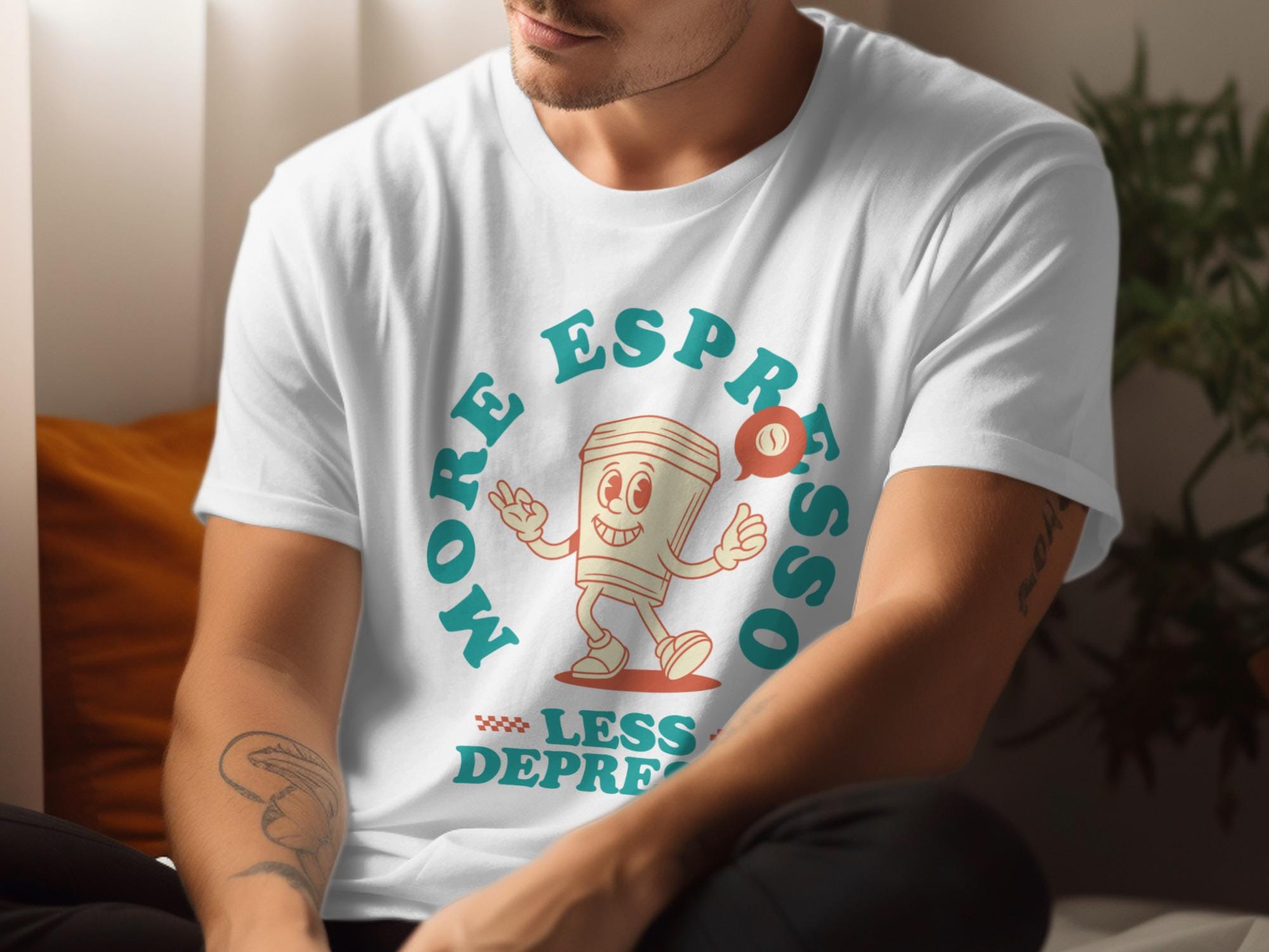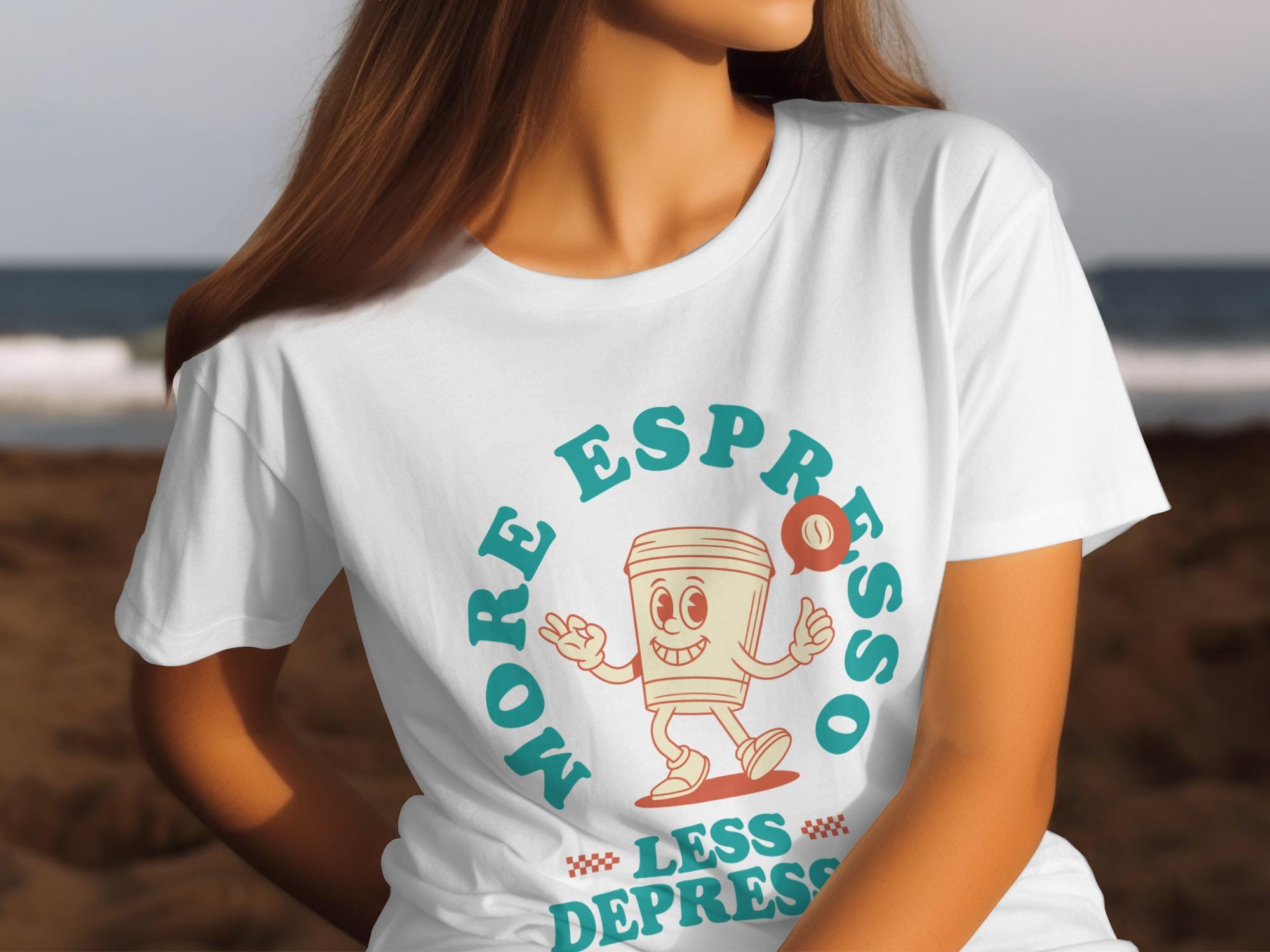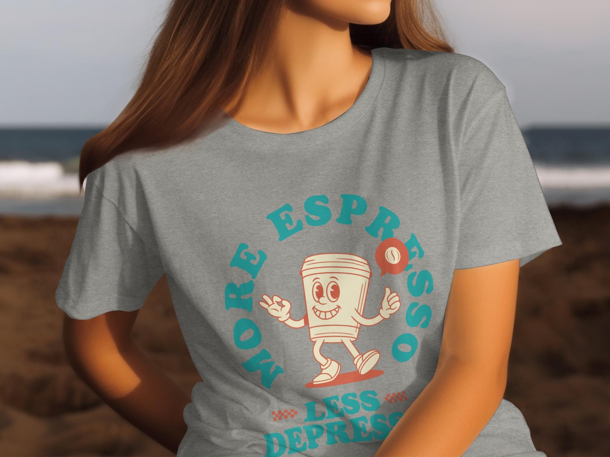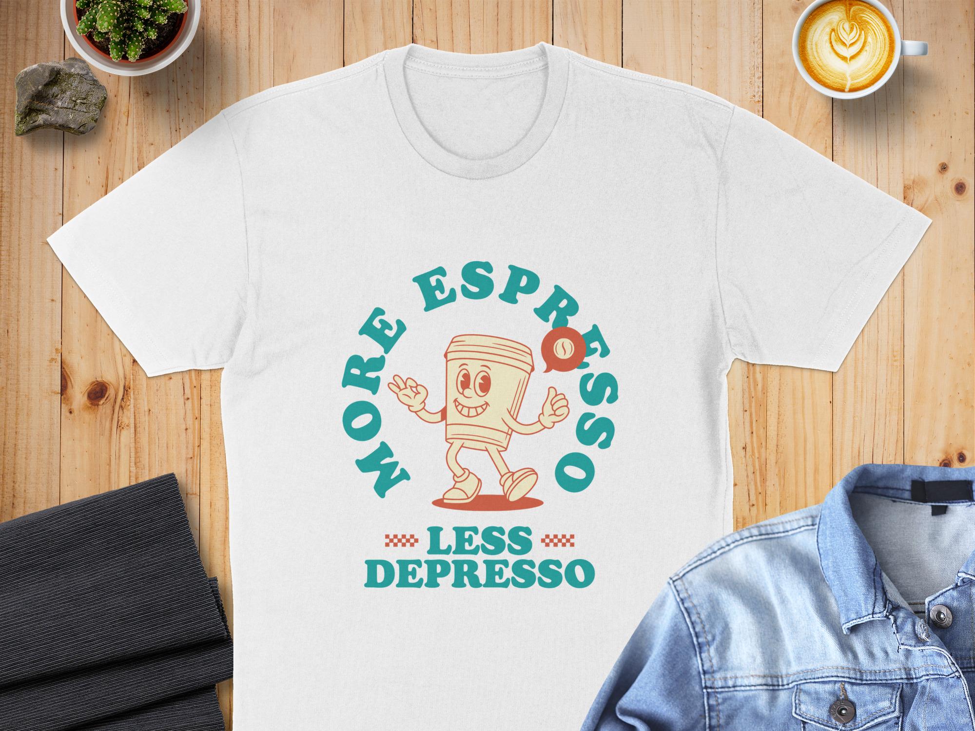 Looking for the perfect T-Shirt to express your love for coffee and good vibes? This "More Espresso Less Depresso" tee is just the thing! Featuring a cute cartoon coffee cup character, this design is sure to bring a smile to your face and those around you.