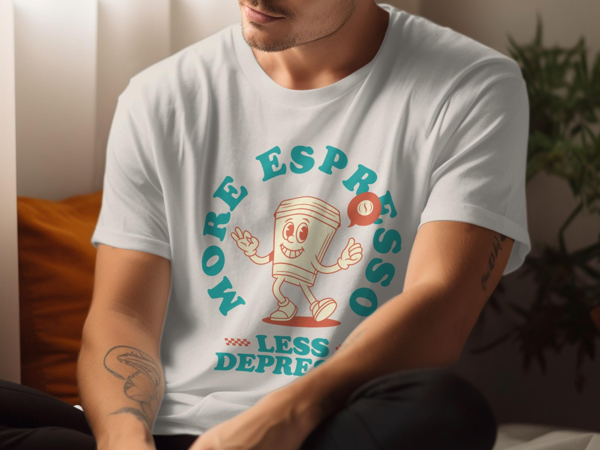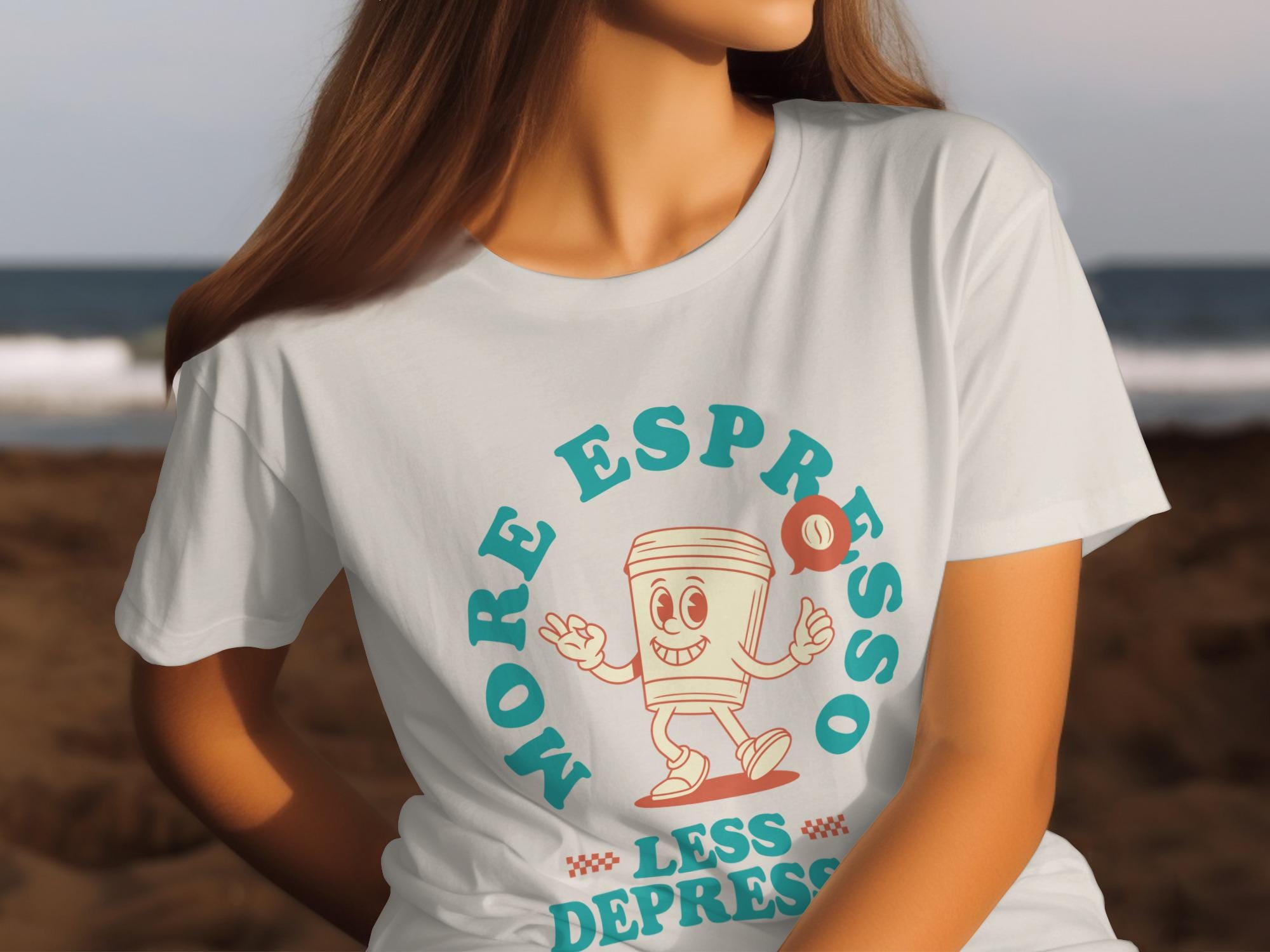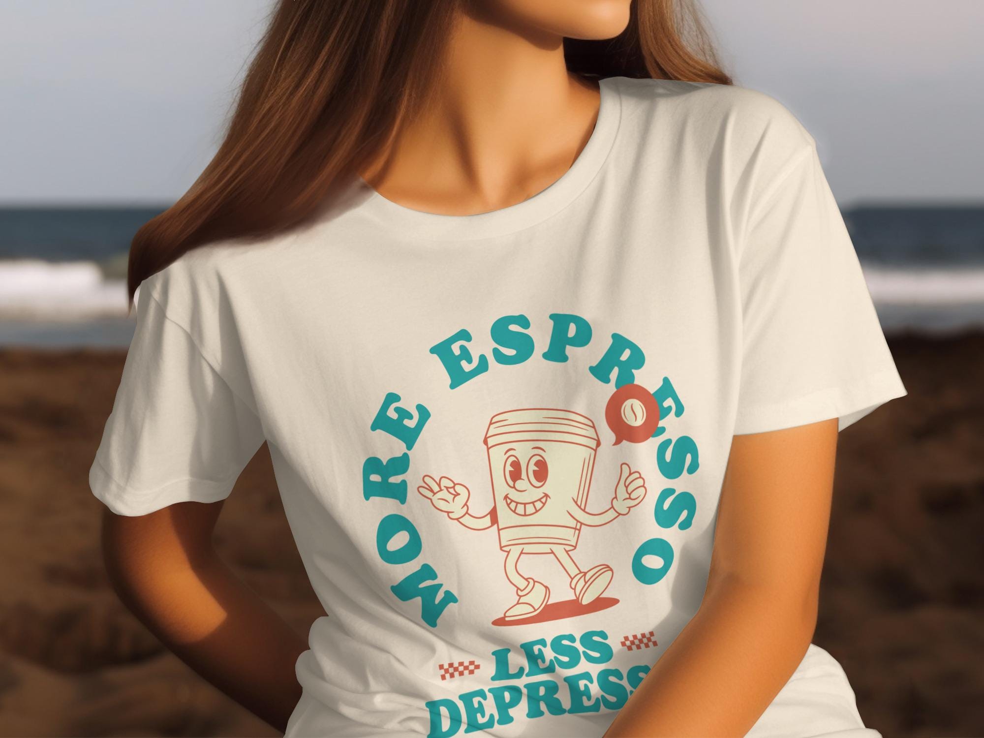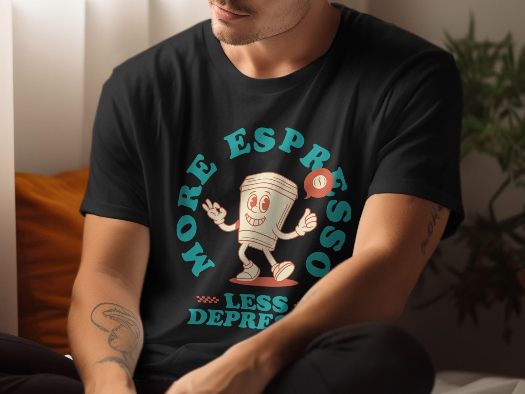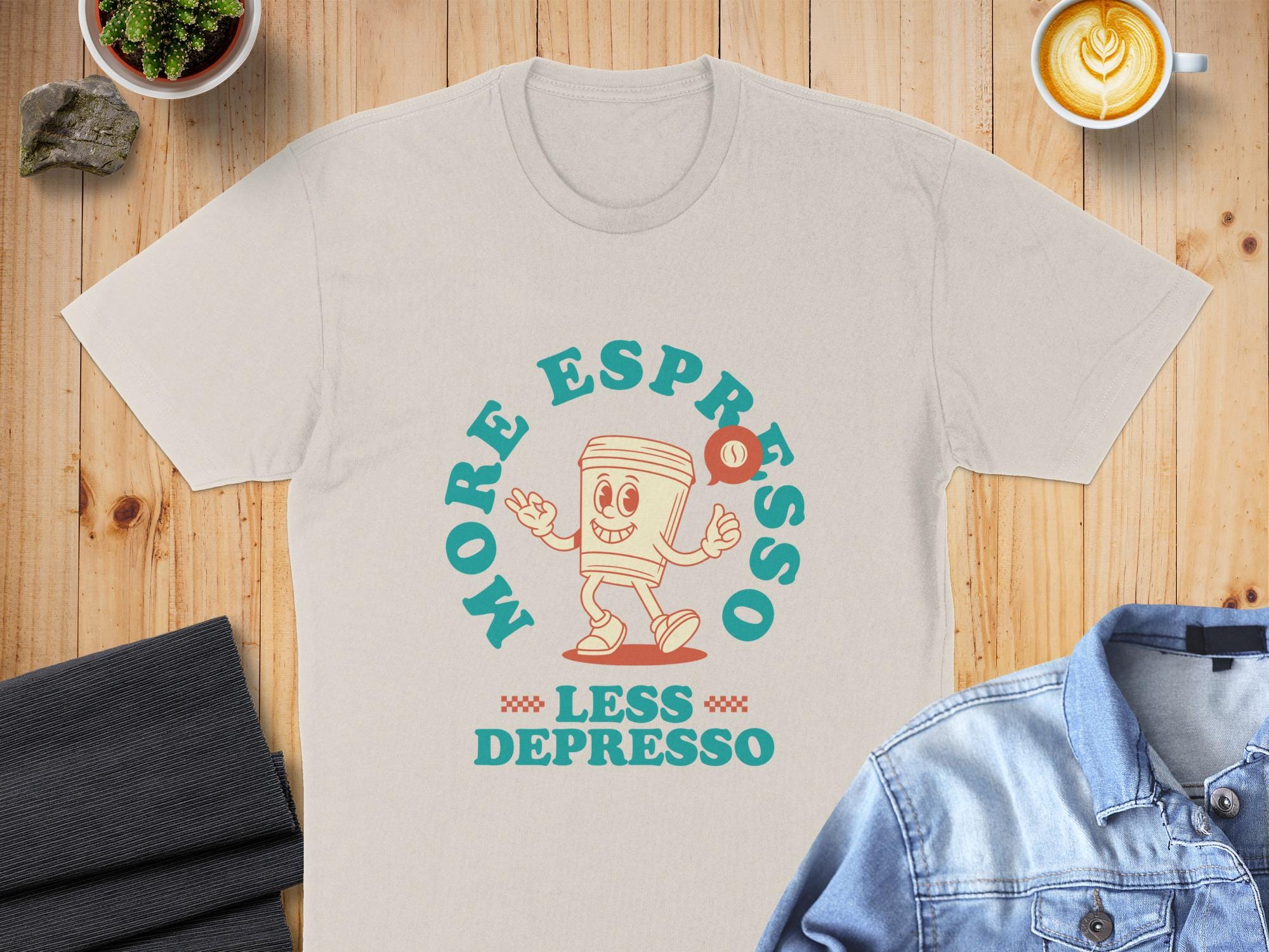 Looking for the perfect T-Shirt to express your love for coffee and good vibes? This "More Espresso Less Depresso" tee is just the thing! Featuring a cute cartoon coffee cup character, this design is sure to bring a smile to your face and those around you.