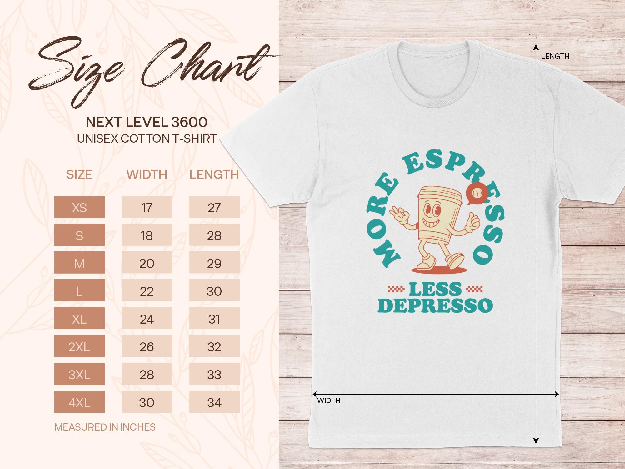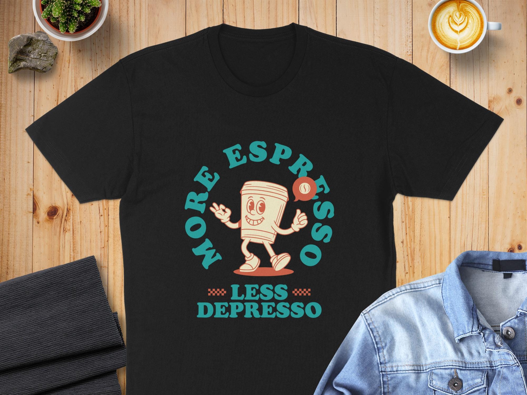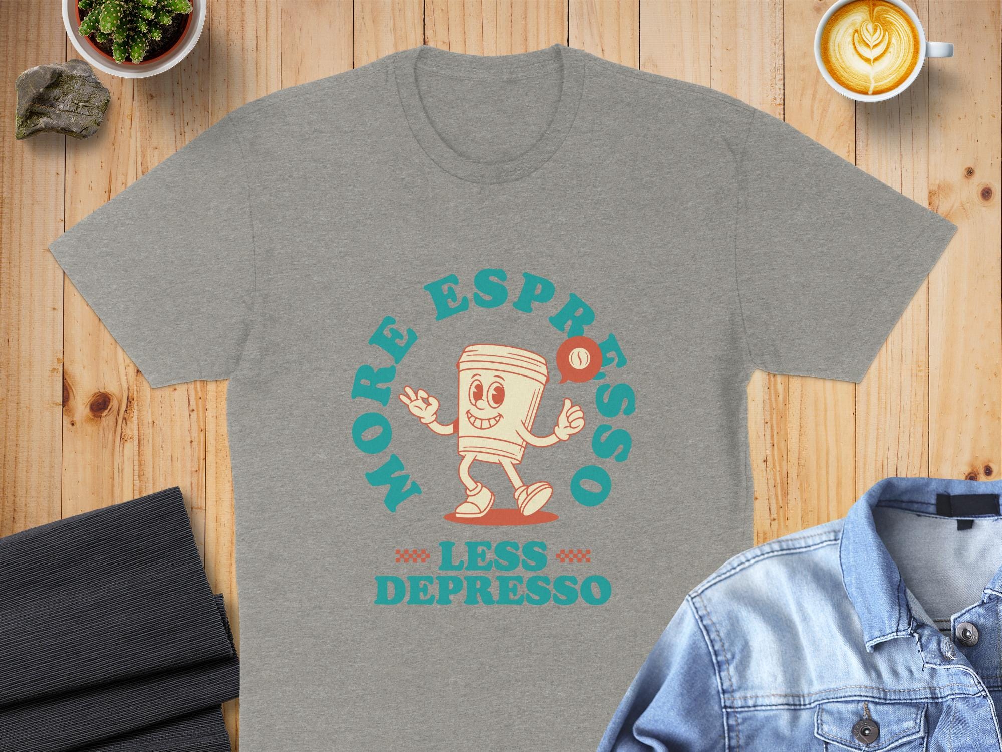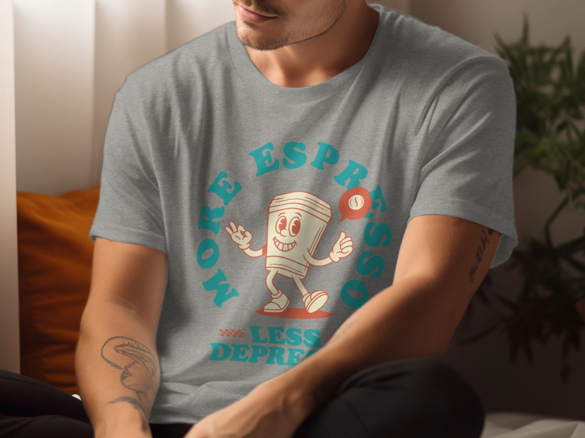 Looking for the perfect T-Shirt to express your love for coffee and good vibes? This "More Espresso Less Depresso" tee is just the thing! Featuring a cute cartoon coffee cup character, this design is sure to bring a smile to your face and those around you.