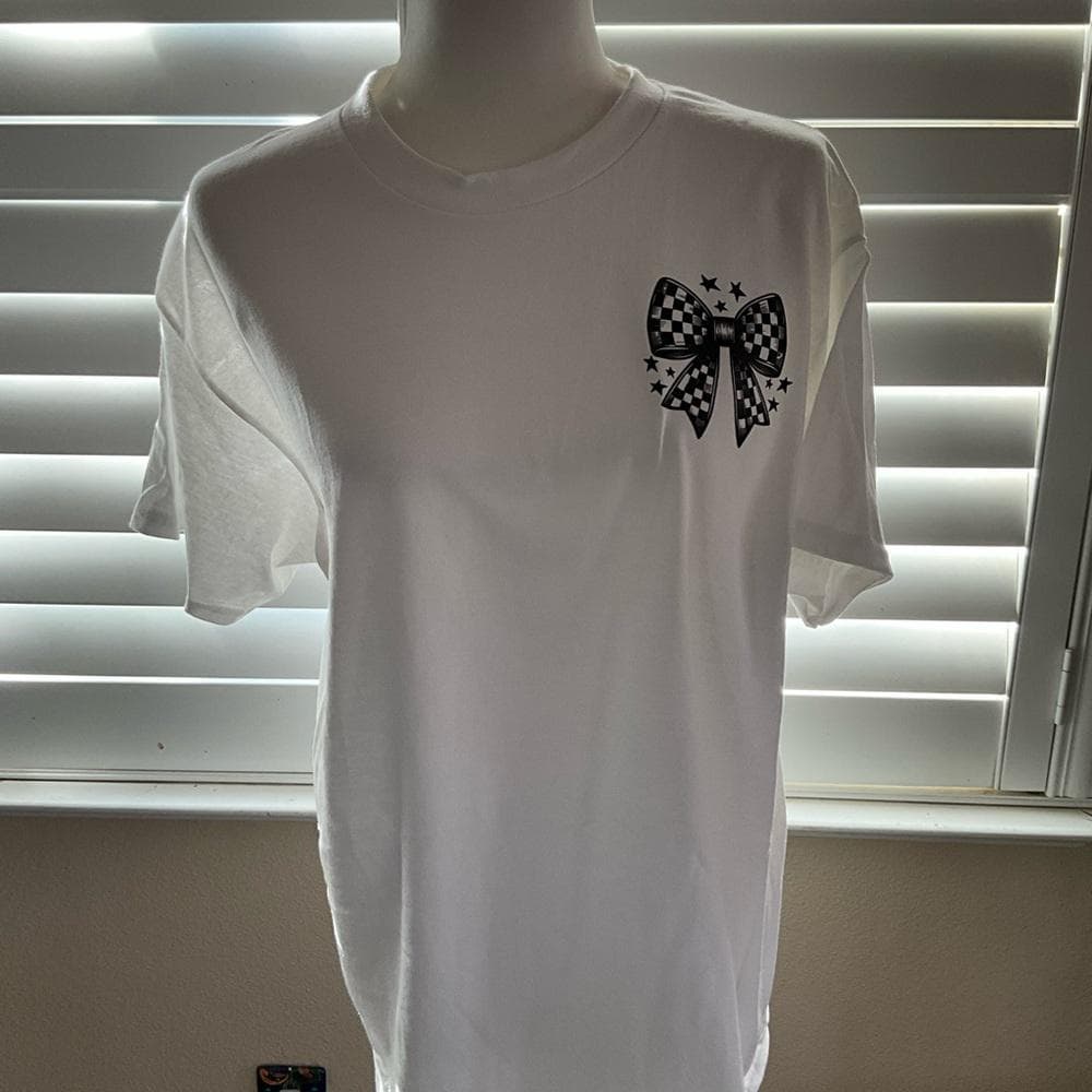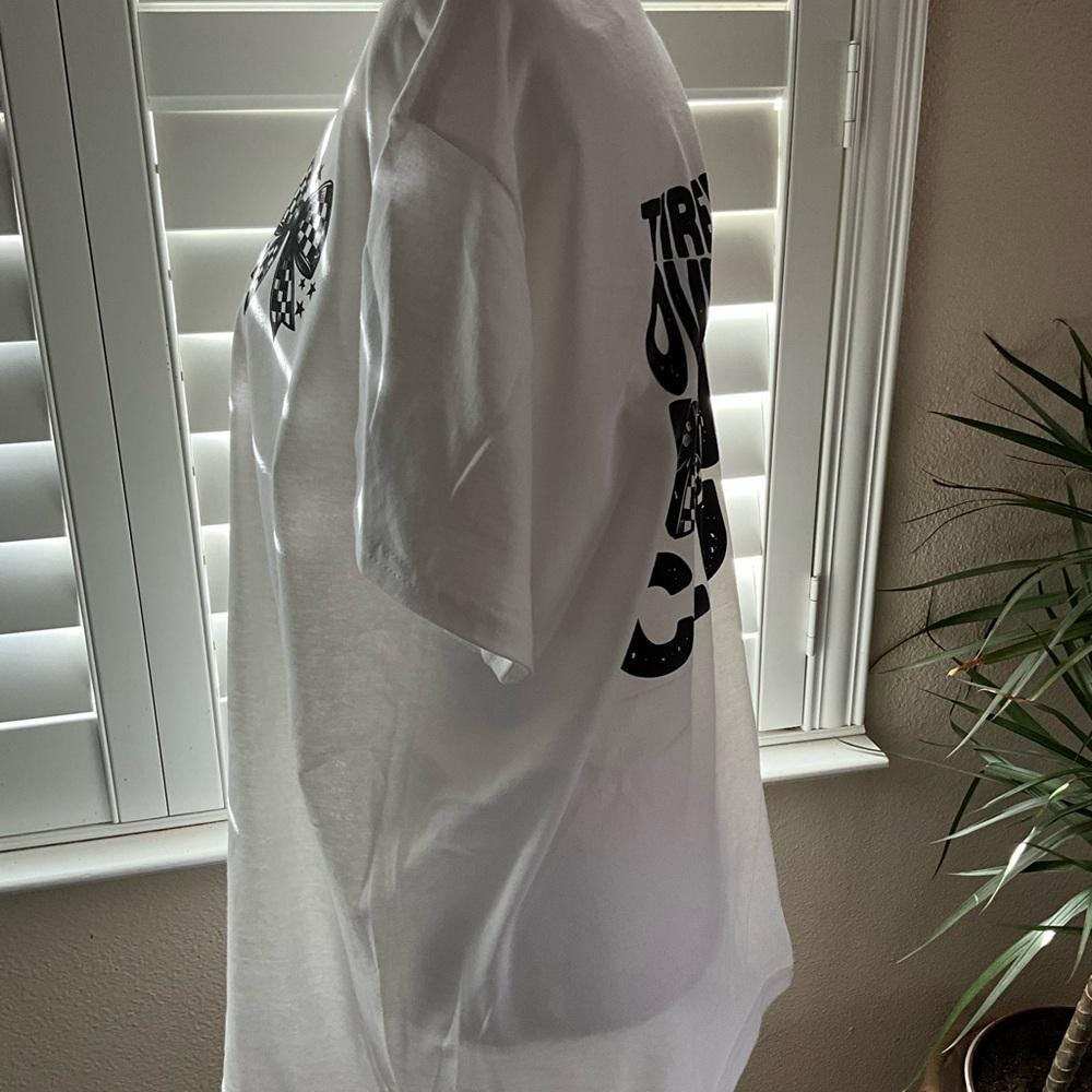 White short-sleeve graphic tee featuring bold black print reading "Tired and Overstimulated Moms Club” on back and coordinating bow on the front. Comfortable everyday shirt with a playful, eye-catching design. Perfect for casual wear and statement-making comfort.
